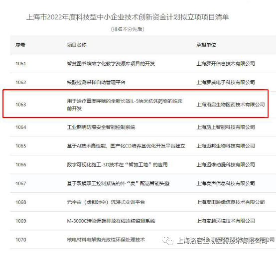 近期,上海市科学技术委员会组织的“上海市2022年度科技型中小企业技术创新资金计划”拟立项项目名单公示完毕,bti必一体育(b-sports)生物“用于治疗重度哮喘的全新长效IL-5纳米抗体药物的临床前开发”项目入围。